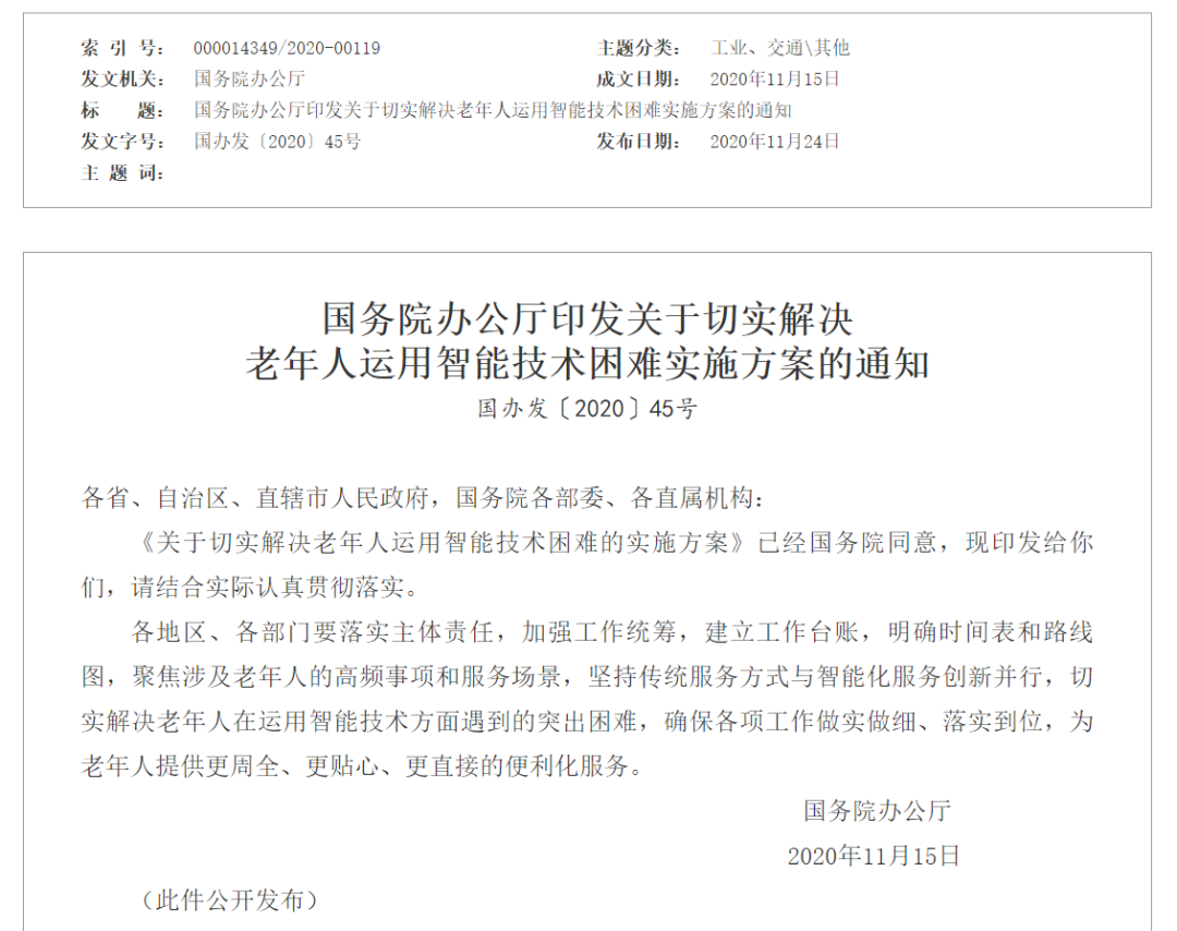 一是完善“健康码”管理,便利老年人通行。各地不得将健康码作为人员通行***凭证。 二是保留传统金融服务方式,任何单位和个人不得以格式条款、通知、声明、告示等方式拒收现金。要改善服务人员的面对面服务,零售、餐饮、商场、公园等老年人高频消费场所,水电气费等基本公共服务费用、行政事业性费用缴纳,应支持现金和银行卡支付。 三是提供多渠道挂号等就诊服务和优化老年人网上办理就医服务。这是针对疫情防控期间医疗机构普遍实施预约制而导致老年人就医不便的措施。 此外,实施方案还从便利老年人日常交通出行、便利老年人使用智能化产品和服务应用、便利老年人办事服务等方面提出了众多工作要求。涉及金融服务方面,实施方案还提出,打造大字版、语音版、民族语言版、简洁版等适老手机银行APP,提升手机银行产品的易用性和安全性,便利老年人进行网上购物、订餐、家政、生活缴费等日常消费。 到2020年底前,集中力量推动各项传统服务兜底保障到位,抓紧出台实施一批解决老年人运用智能技术***迫切问题的有效措施,切实满足老年人基本生活需要。 到2021年底前,围绕老年人出行、就医、消费、文娱、办事等高频事项和服务场景,推动老年人享受智能化服务更加普遍,传统服务方式更加完善。 到2022年底前,老年人享受智能化服务水平显著提升、便捷性不断提高,线上线下服务更加高效协同,解决老年人面临的“数字鸿沟”问题的长效机制基本建立。 |